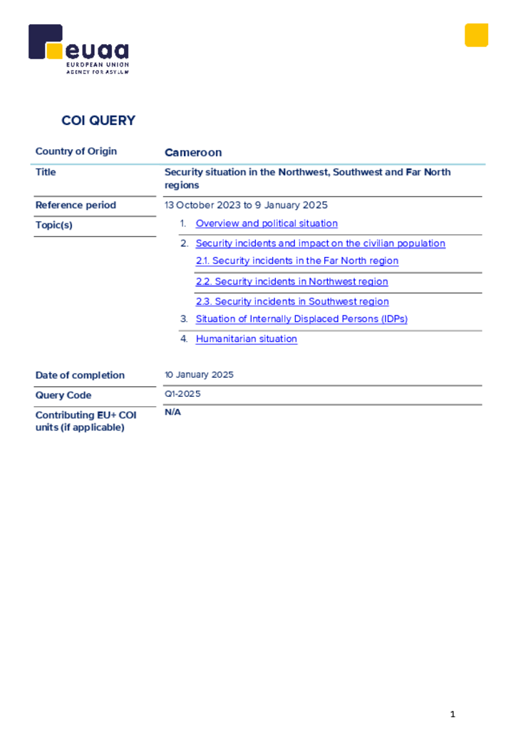 Reference period: 13 October 2023 to 9 January 2025; 1. Overview and political situation; 2. Security incidents and impact on the civilian population; 2.1. Security incidents in the Far North region; 2.2. Security incidents in Northwest region; 2.3. Security incidents in Southwest region; 3.